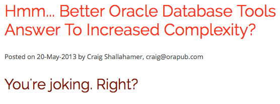| Hmm... Better Oracle Database Tools Are the Answer To Increased Complexity? | Does An Oracle Commit Always Have A Blank, Empty Or Null SQL_ID? | How To Quickly Install The Free Statistics Package R | |||